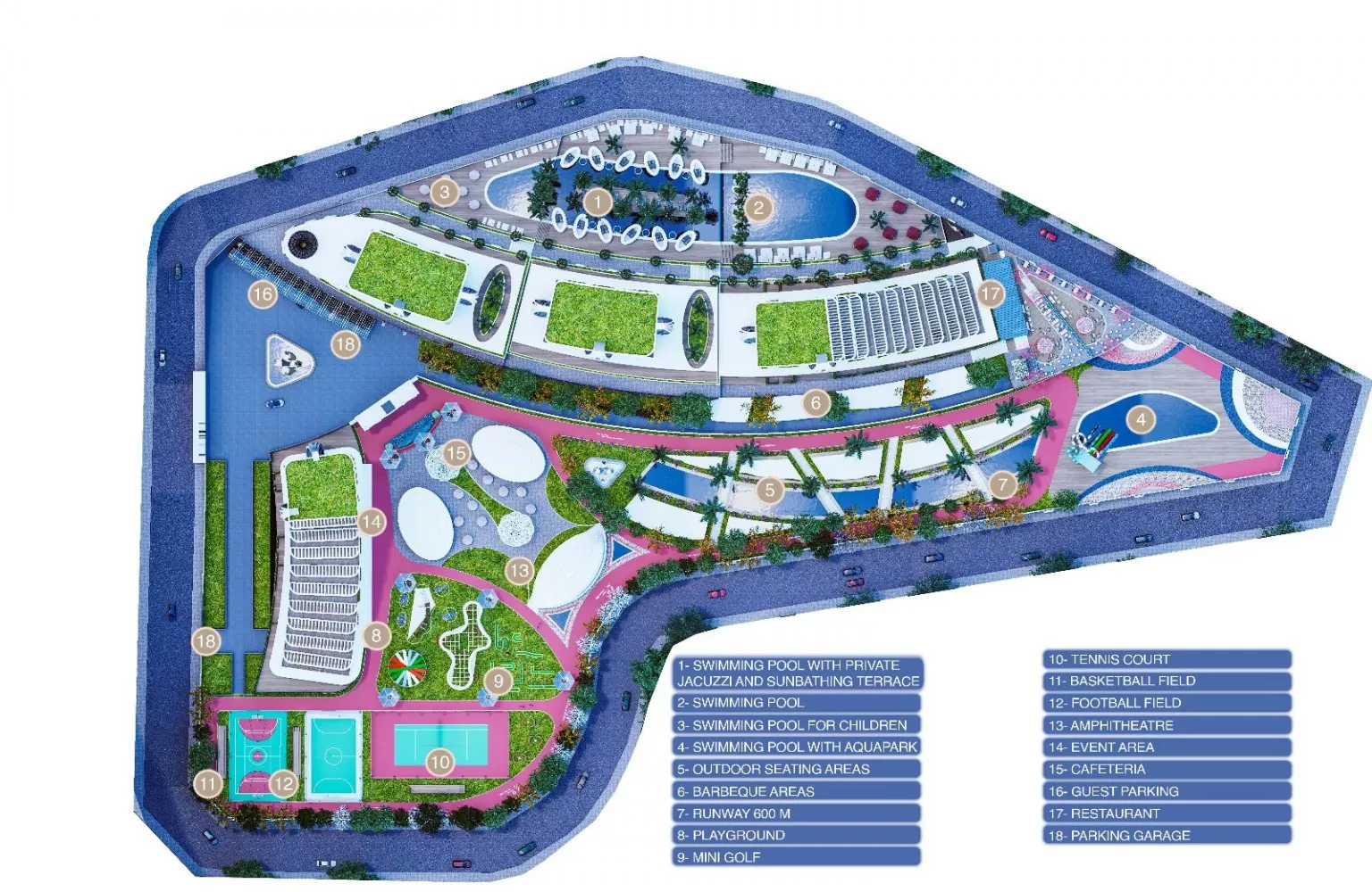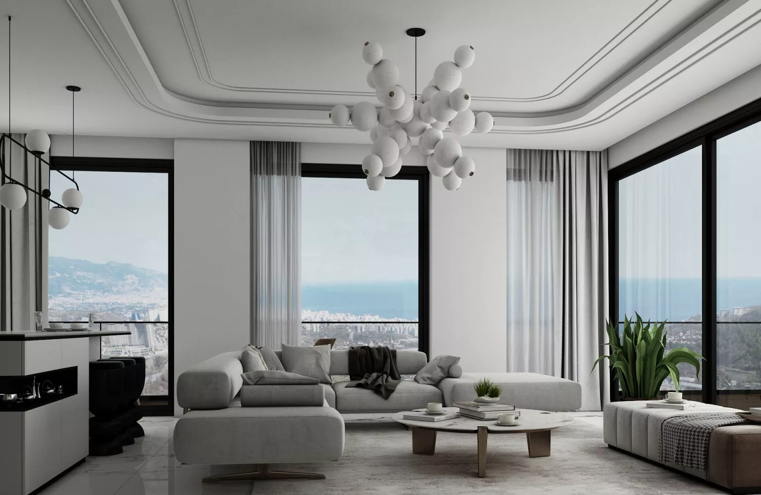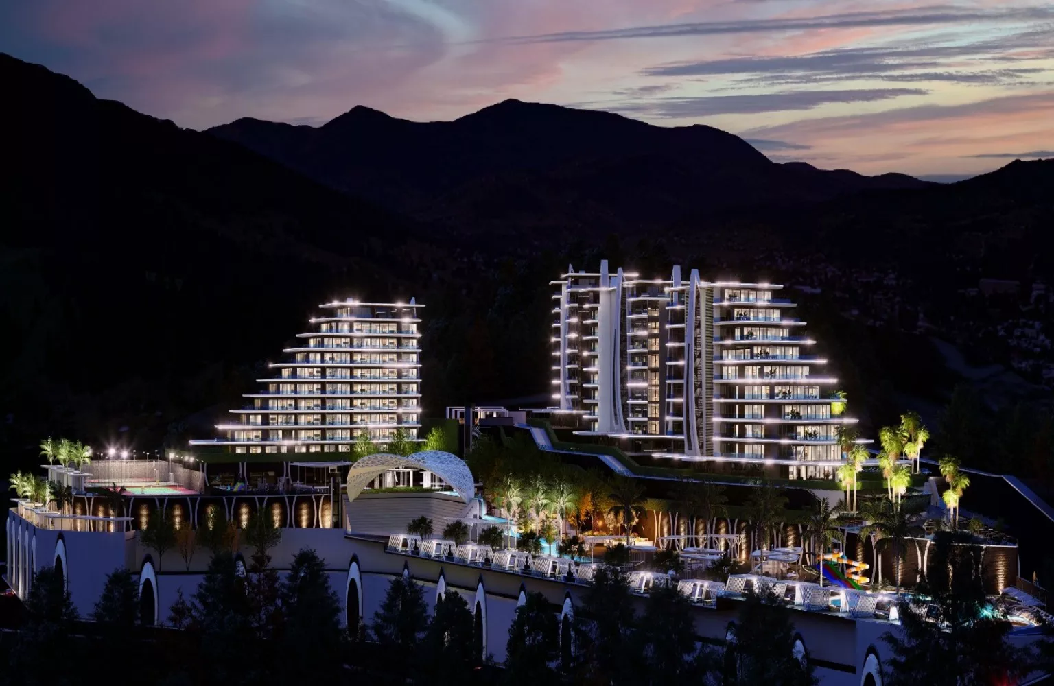 تُبنى الشقق والفلل تحت الإنشاء بالعمارة الحديثة والمواد عالية الجودة. تم تصميمها لحياة مريحة، حيث تحتوي على أنظمة المنازل الذكية، شرفات واسعة، مطابخ حديثة، ومساحات معيشة فسيحة. الفيلات مزودة بمسابح خاصة، حدائق كبيرة، وإطلالات بانورامية. بالإضافة إلى ذلك، تشمل المرافق داخل المجمعات مسابح، صالات رياضية، مناطق ألعاب للأطفال، حمامات تركية، ساونا، ومناطق اجتماعية متنوعة.