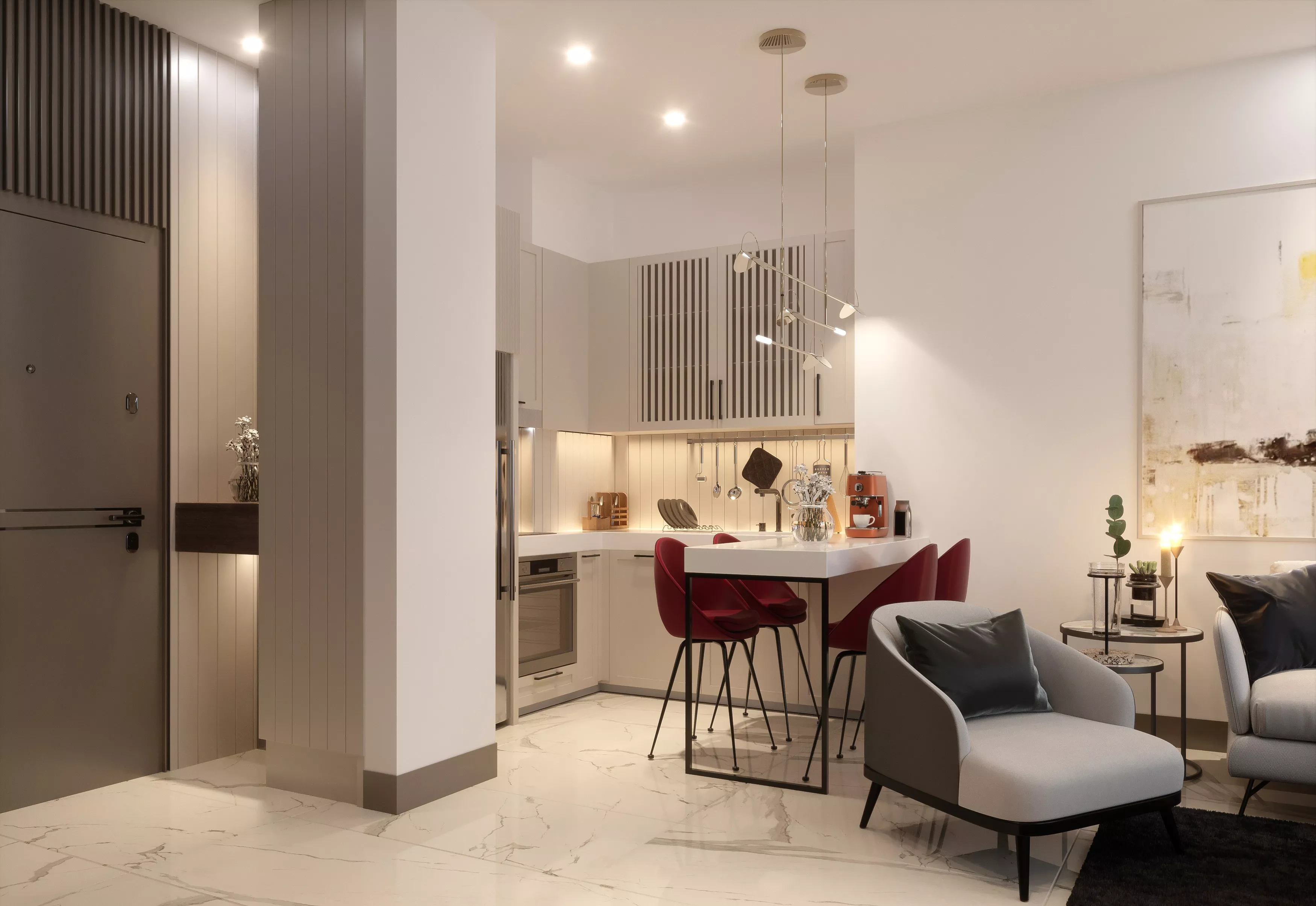 صالة استقبال راقية: مدخل مصمم بأناقة لاستقبال الزوار وإضفاء شعور بالفخامة.