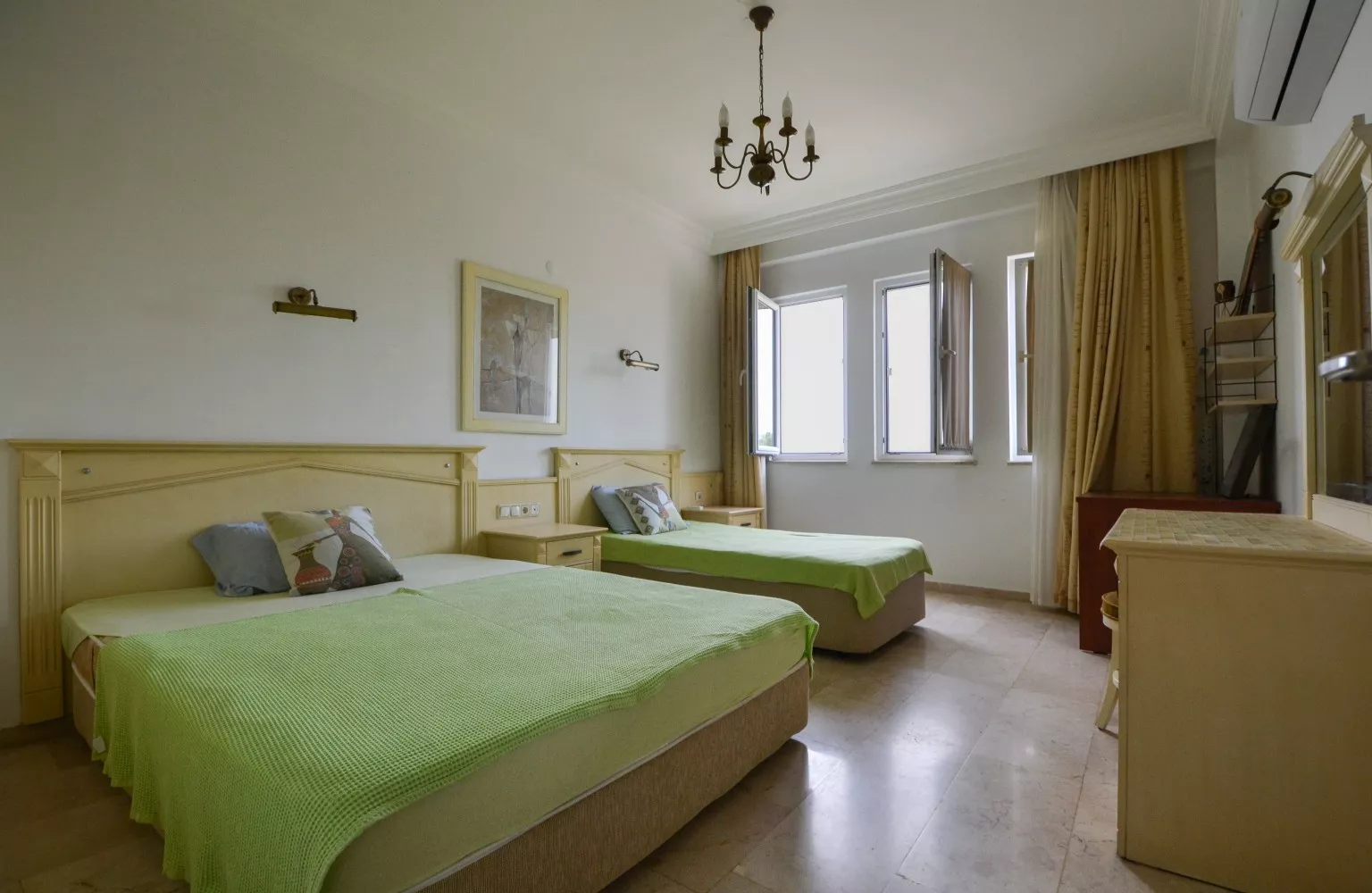 Die Wohnung verfügt über eine offene Küche, 3 Schlafzimmer, zwei Badezimmer, ein Wohnzimmer und zwei Balkone.