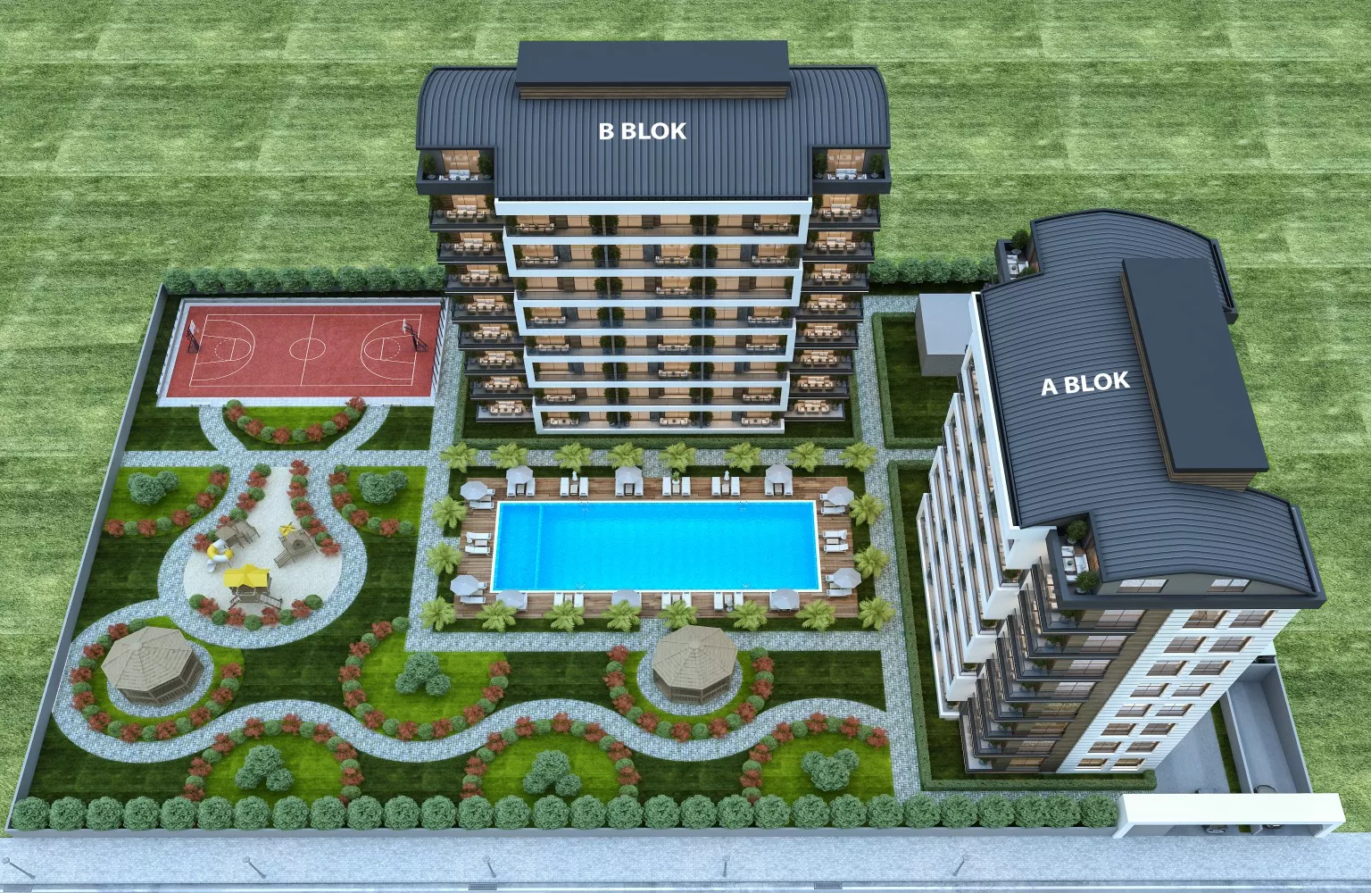 Located in the up-and-coming Antalya Aksu Altıntaş area, Beyoğlu Residence offers a premium living experience with its modern design, spacious layouts, and extensive amenities. Spread across a 5700 m² plot, with 3000 m² of lush green space, this residence is designed to provide a balanced lifestyle, blending comfort, luxury, and nature.