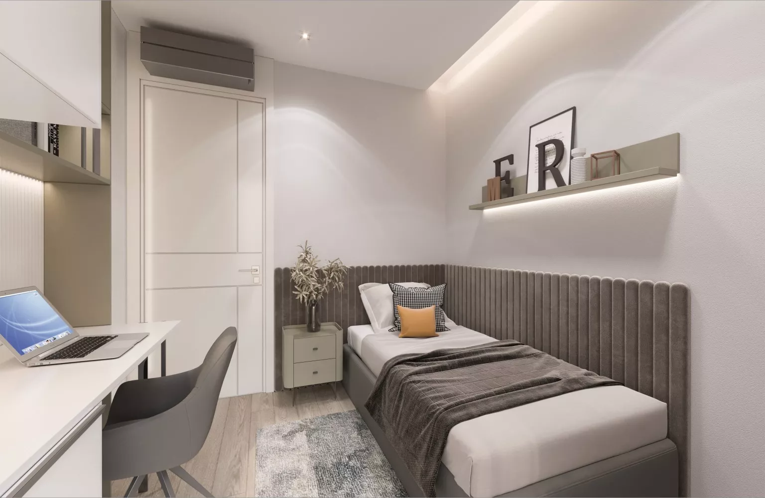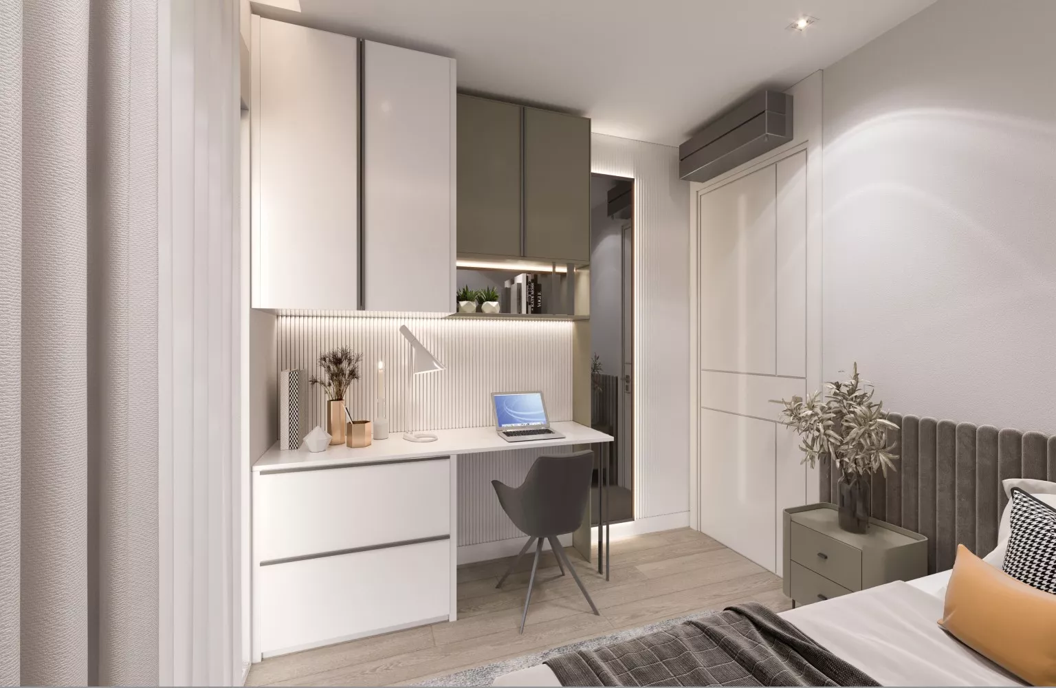 The wet floors are covered with premium Bien brand ceramic tiles, offering durability and style. The open-plan kitchen is outfitted with lac panel and MDF cabinets along with Lamar brand porcelain countertops, ensuring both functionality and elegance. The 3-piece Bosch built-in kitchen set enhances the convenience and sophistication of each home, while the wardrobe provides ample storage space.