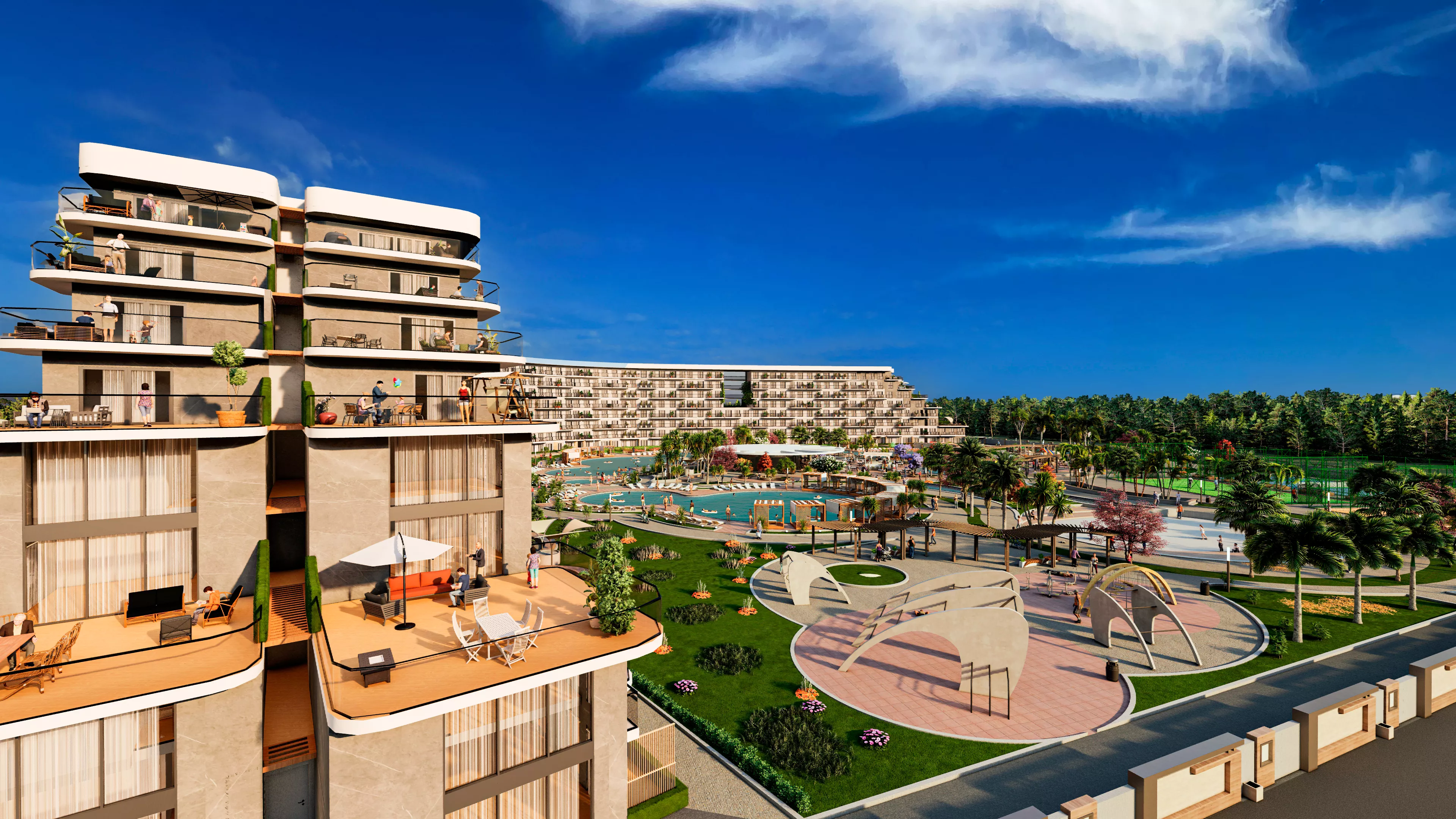 Apartments and villas under construction are built with modern architecture and high-quality materials. Designed for a comfortable life, they feature smart home systems, spacious balconies, modern kitchens, and airy living spaces. The villas are equipped with private pools, large gardens, and panoramic views. Additionally, on-site amenities include swimming pools, gyms, children's play areas, Turkish baths, saunas, and various social areas.