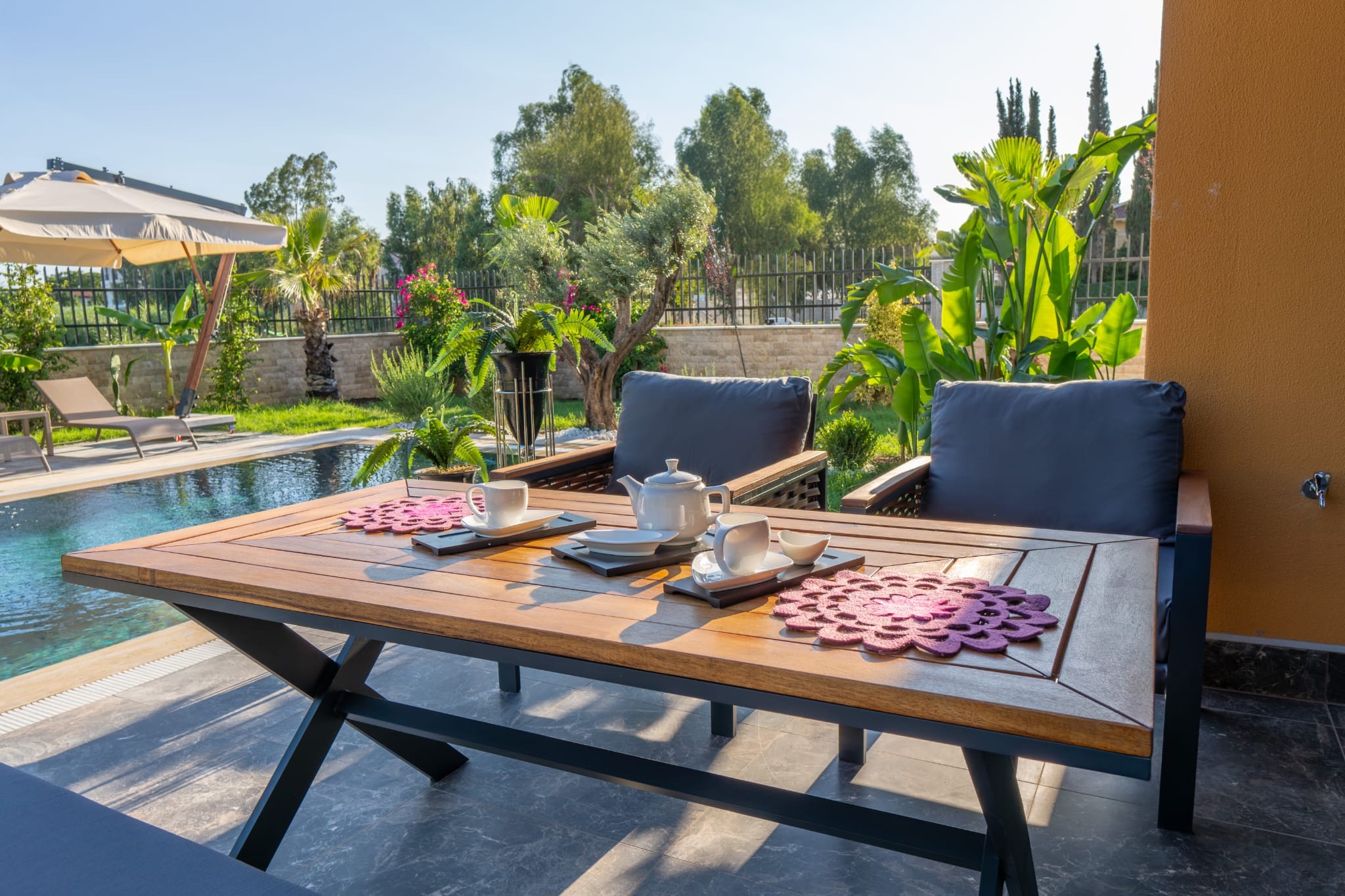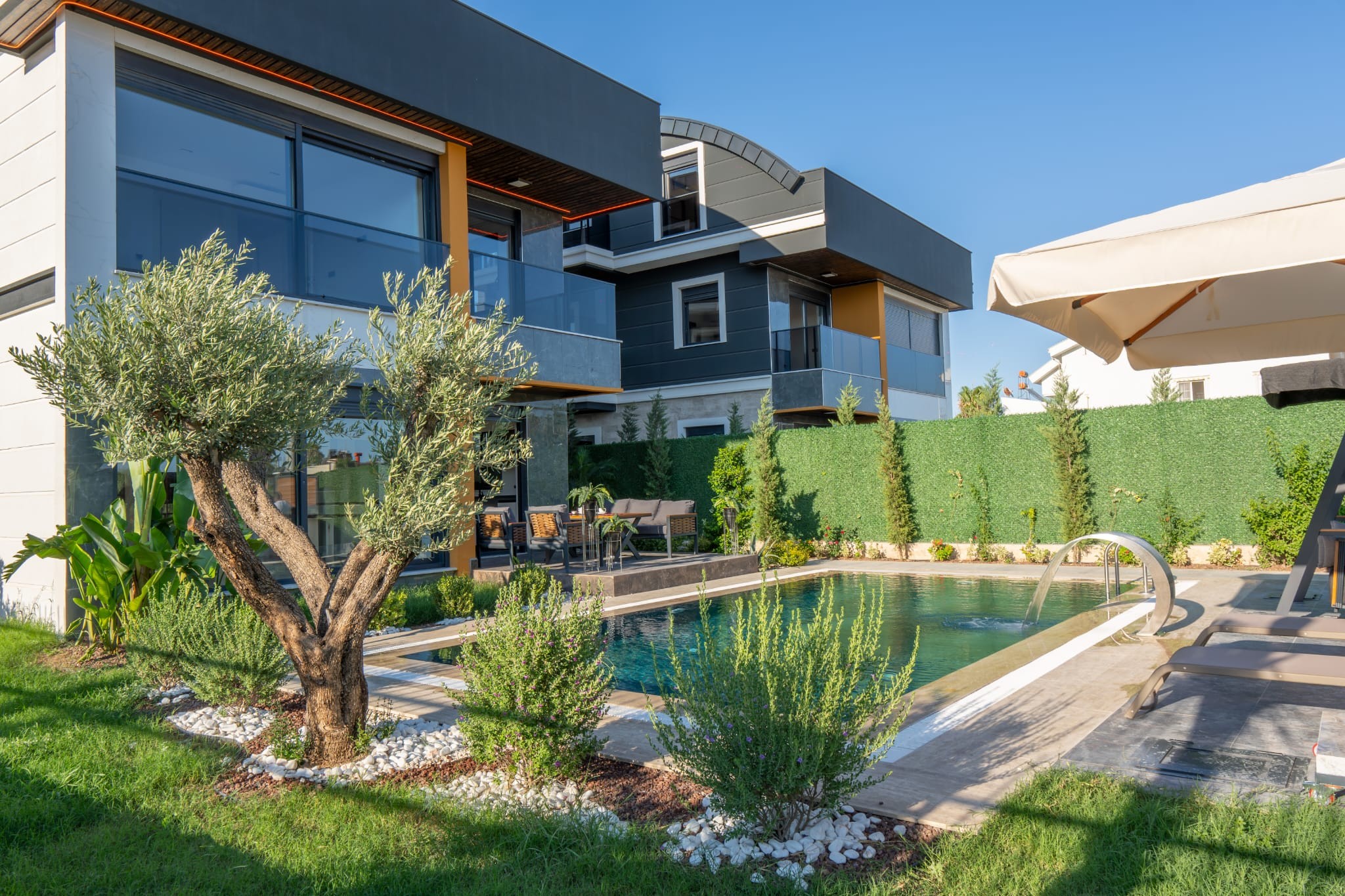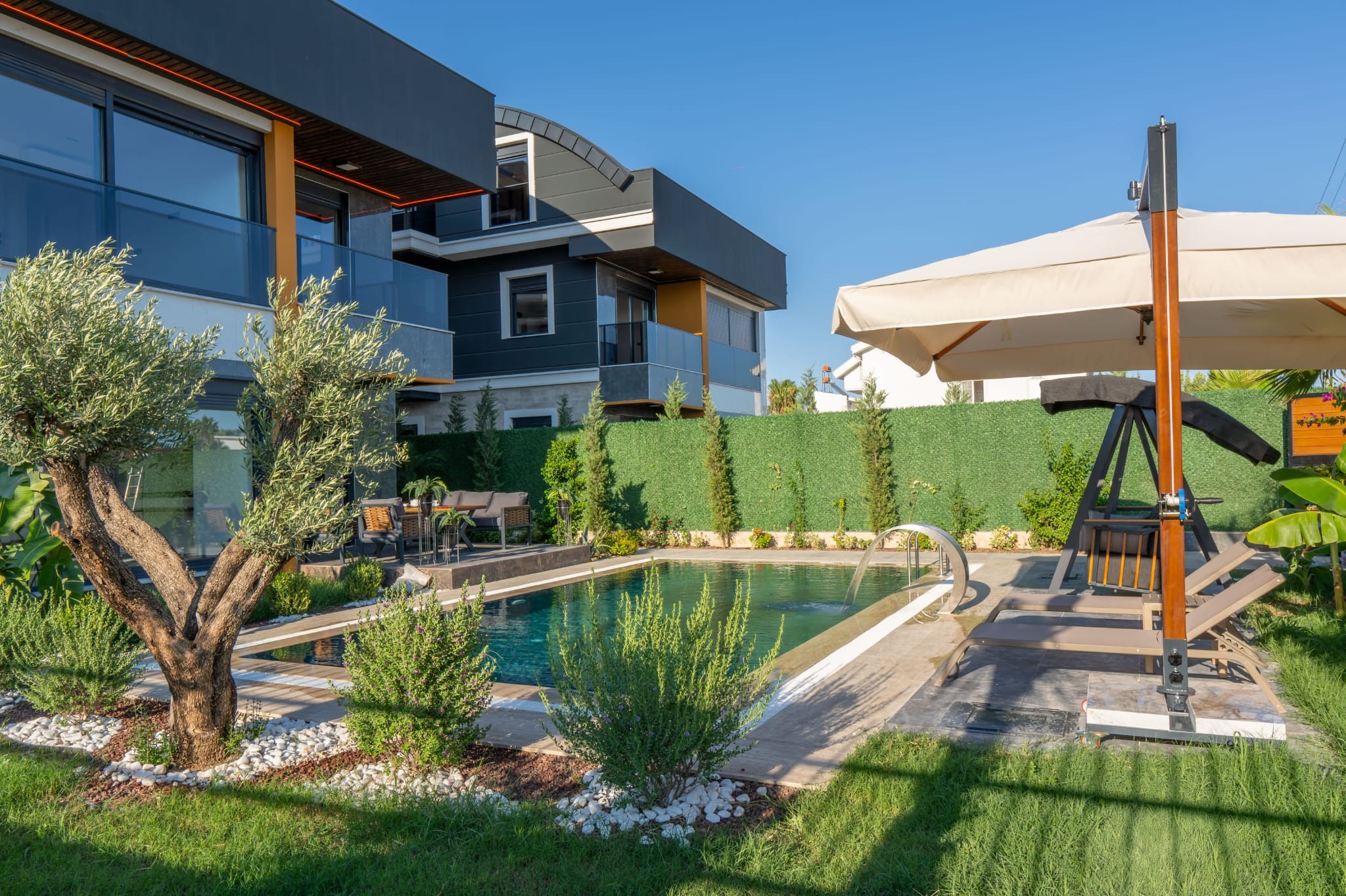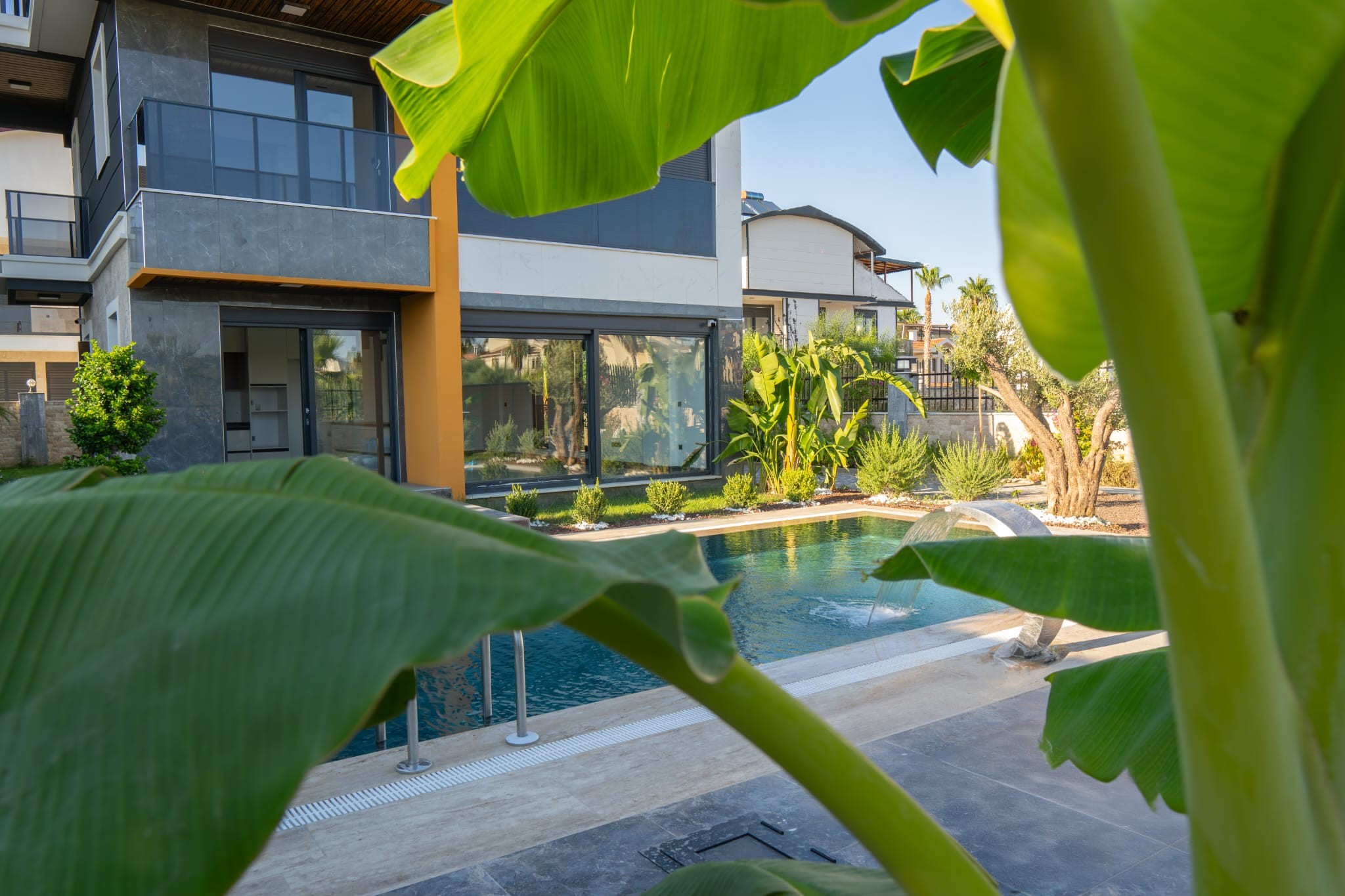 The landscaped garden features a combination of tropical and Mediterranean trees, creating a serene and elegant atmosphere. Stone-covered pool walls and detailed façade cladding enhance the property’s aesthetic appeal.