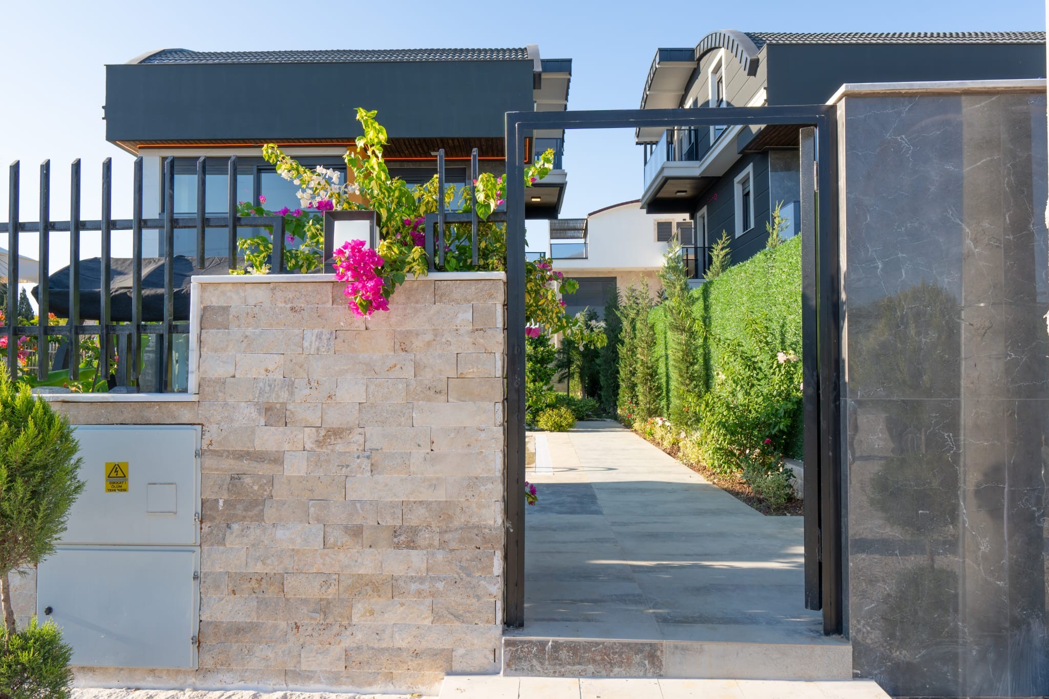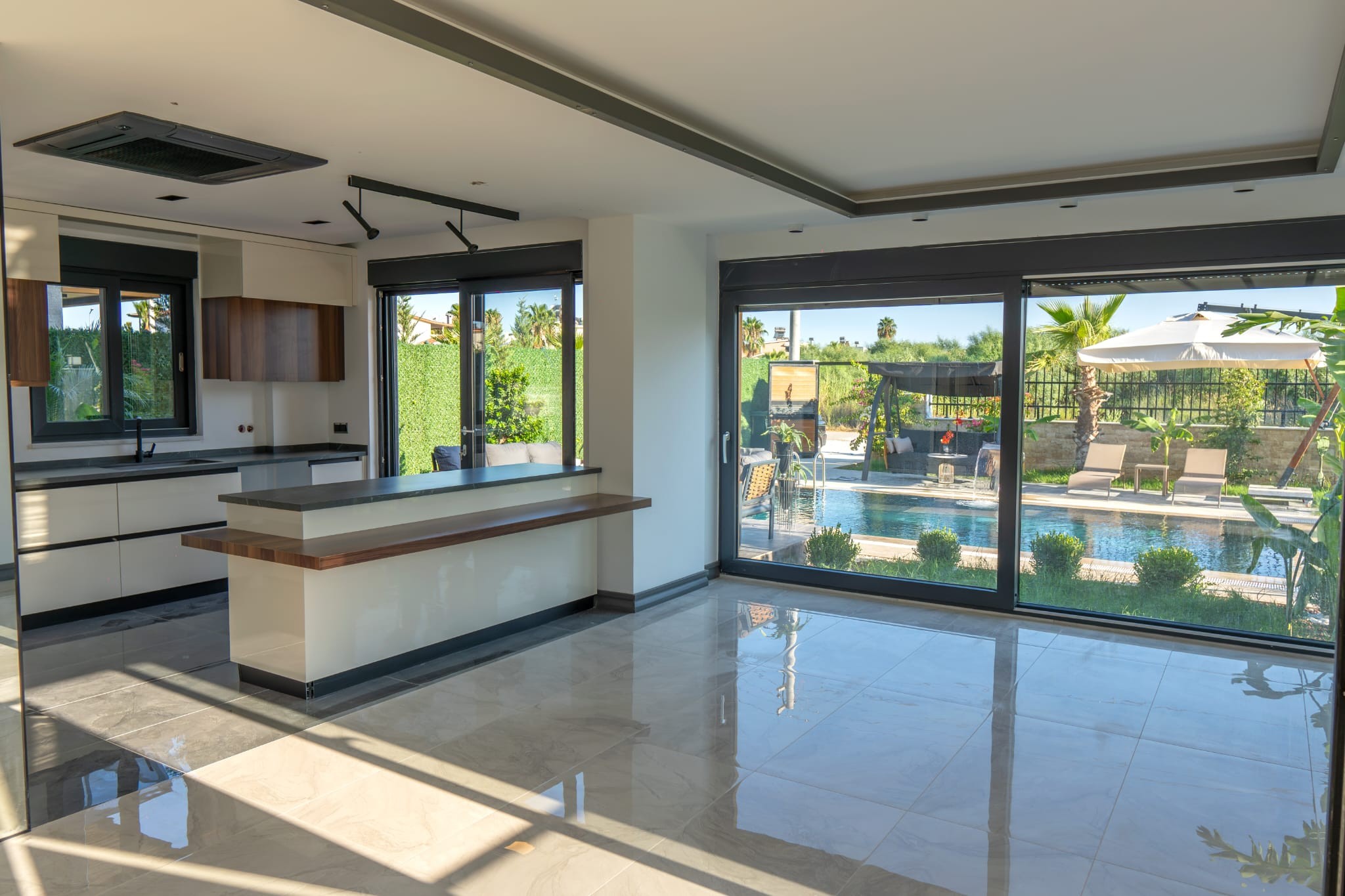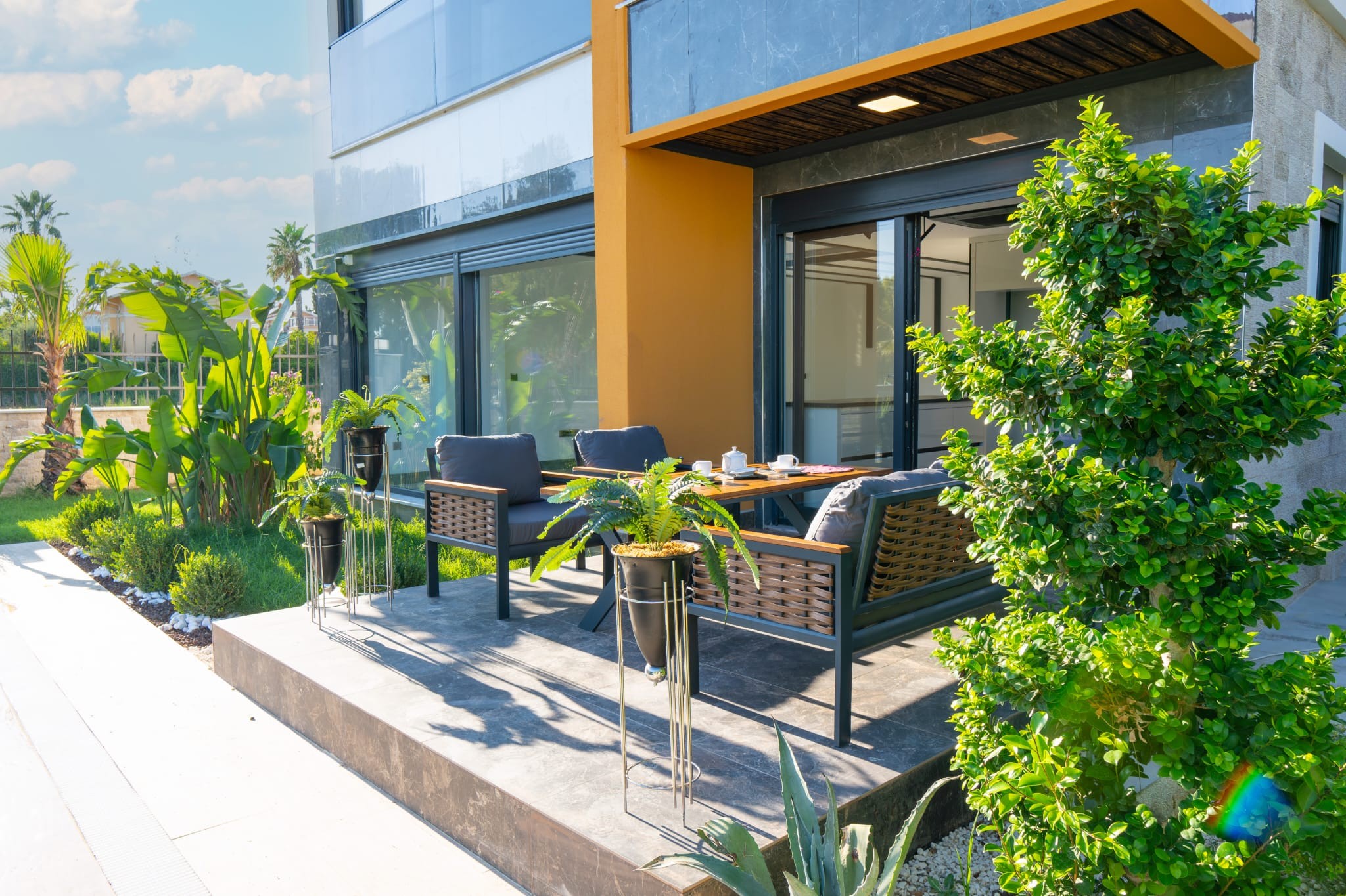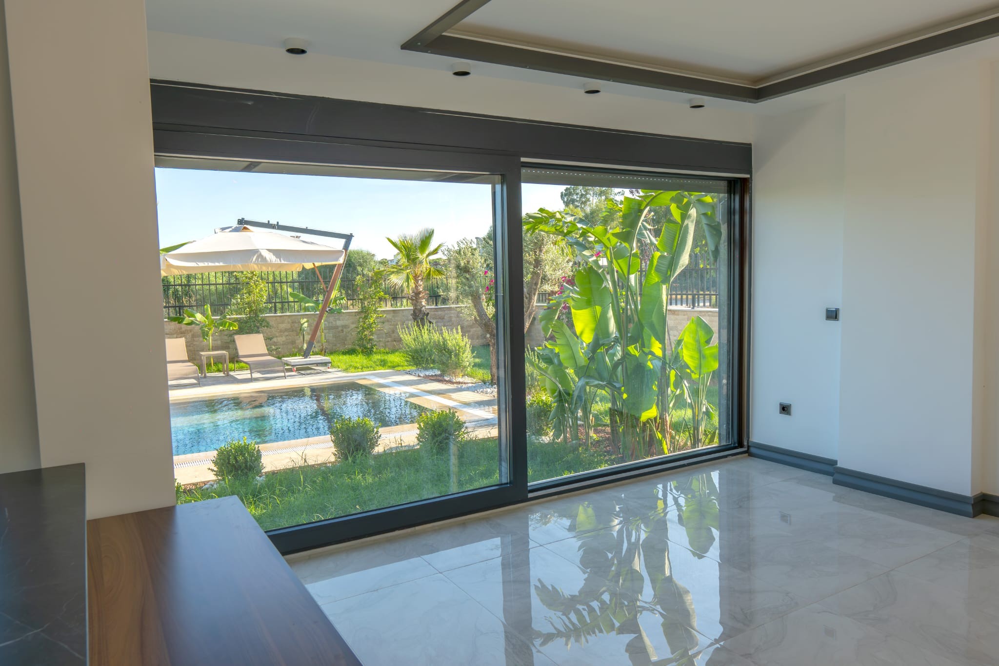 The landscaped garden features a combination of tropical and Mediterranean trees, creating a serene and elegant atmosphere. Stone-covered pool walls and detailed façade cladding enhance the property’s aesthetic appeal.