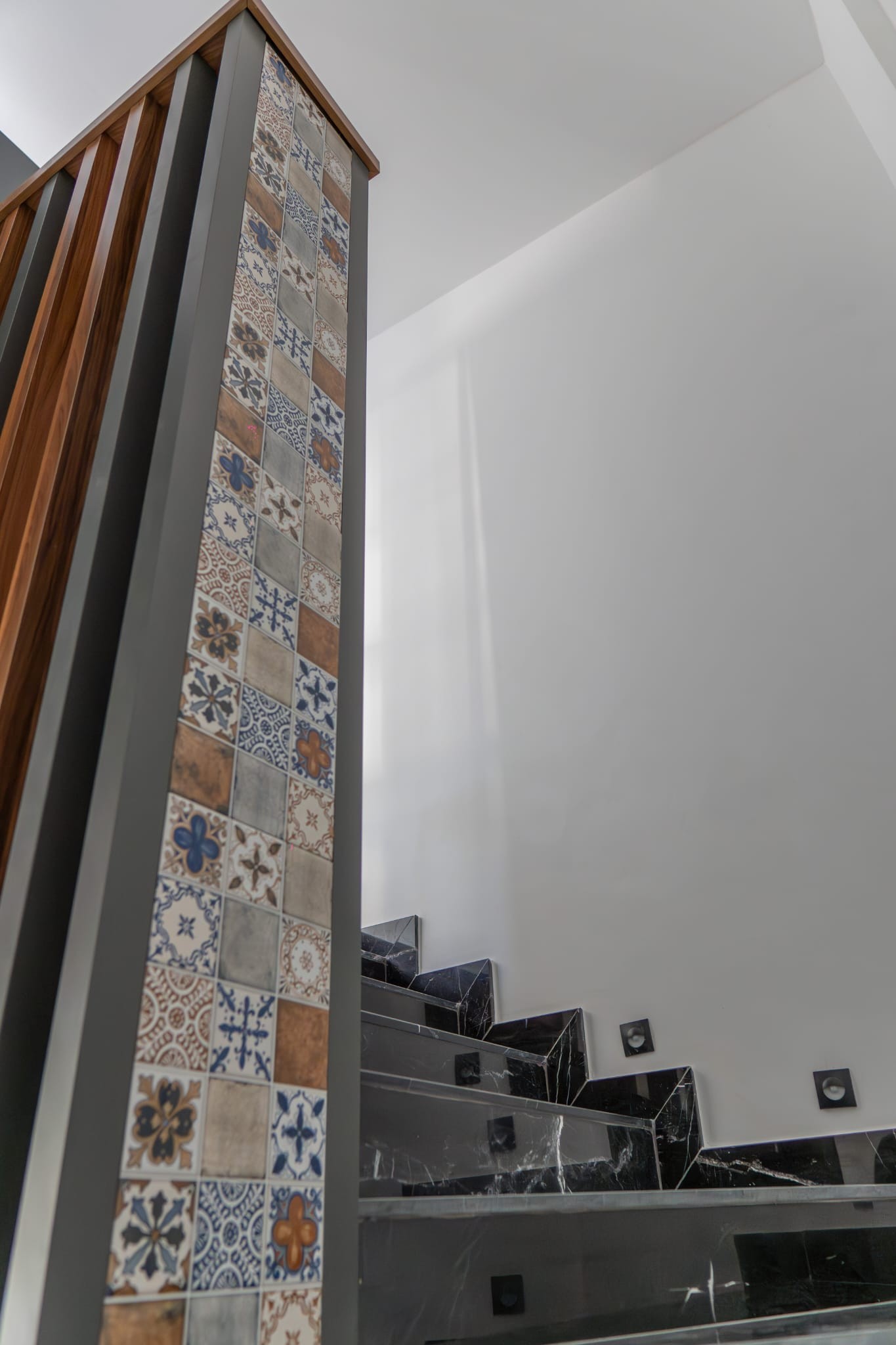 The roof combines special steel and concrete tiles with standing seam metal for superior insulation and durability. Exterior walls are finished with insulated cladding and natural stone details, while pool walls are covered entirely with decorative stone.